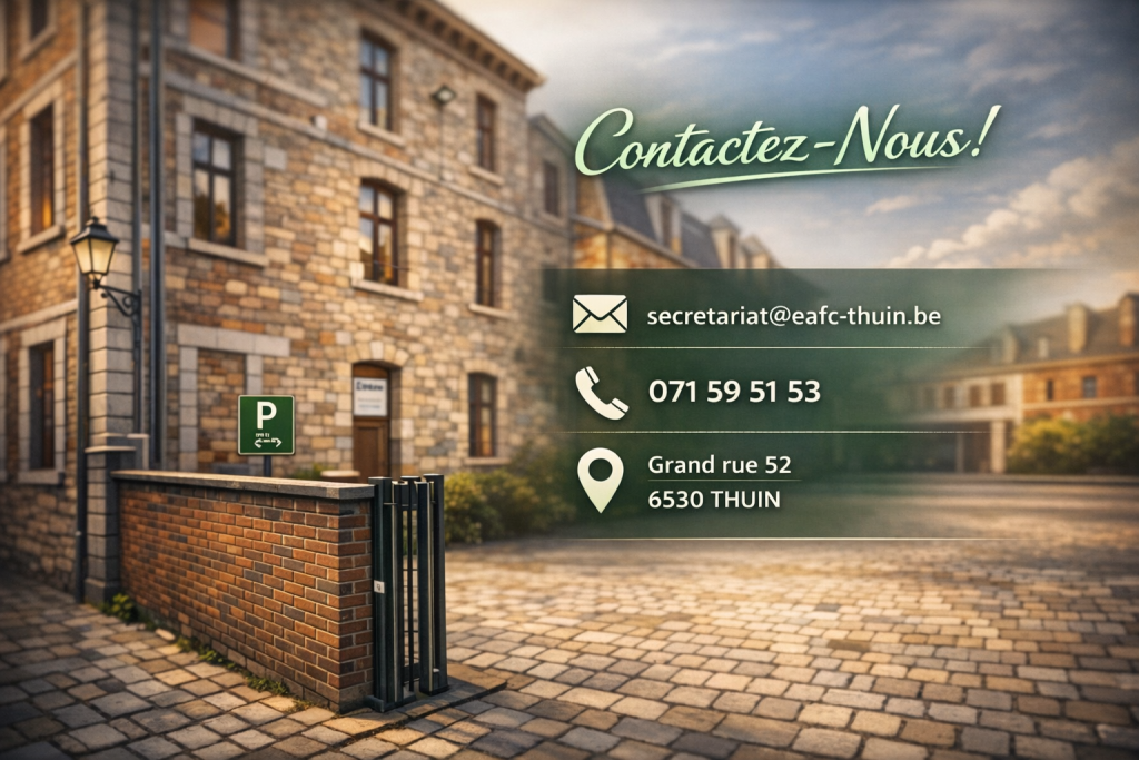 C O N T A C T Votre avenir commence ici. Parlons-en ensemble. N’hésitez pas à nous contacterpour de plus amples informations.Veuillez tenir compte qu’en période d’inscriptions, nos lignes téléphoniques sont souvent occupées. Merci pour votre compréhension et votre patience. Ouverture du secrétariatDu lundi au jeudi de 8H30 à 21H00Vendredi 8H30 à 16H071 59 51 53 InscriptionA partir du 1 Juin 2026Uniquement sur rendez-vousrdv@eafc-thuin.be ou 071 59 51 53 AdresseGrand rue 526530 THUINParking paysager du FauconnierUn parking de 66 places est accessible à proximité immédiate, rue Benoît Constant Fauconnier, le long du rempart Nord. Envoyez-nous un message Nom *Email *Téléphone *Message *Envoyer